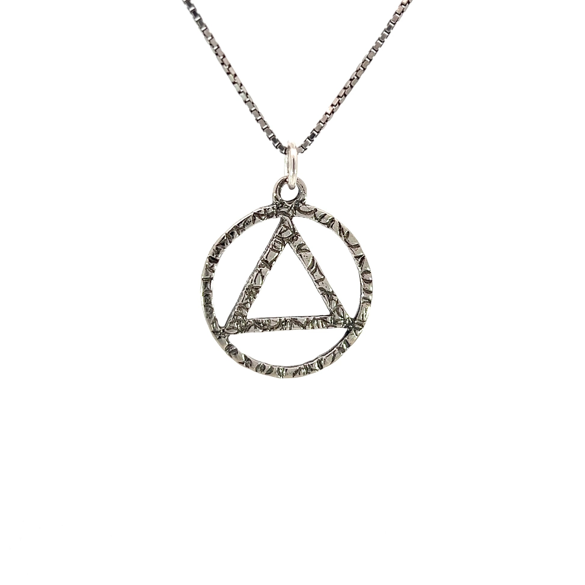 This bold and meaningful Sterling Silver AA Pendant features the classic Alcoholics Anonymous circle and triangle symbol with a unique textured hand finish. The organic texture adds depth and a rugged quality to the piece—symbolizing the real, raw strength found on the recovery journey.