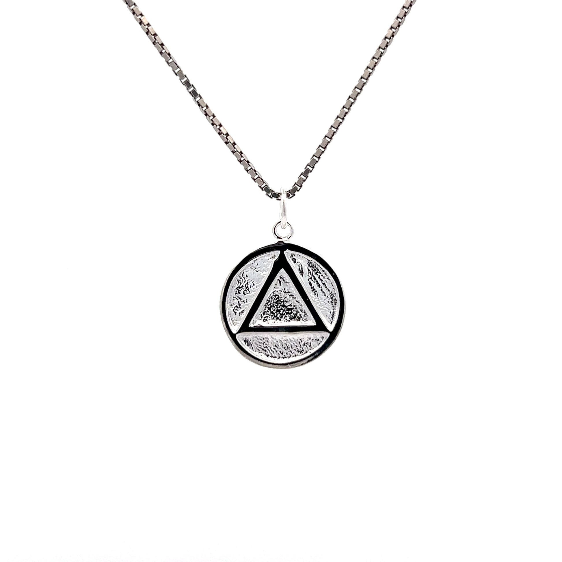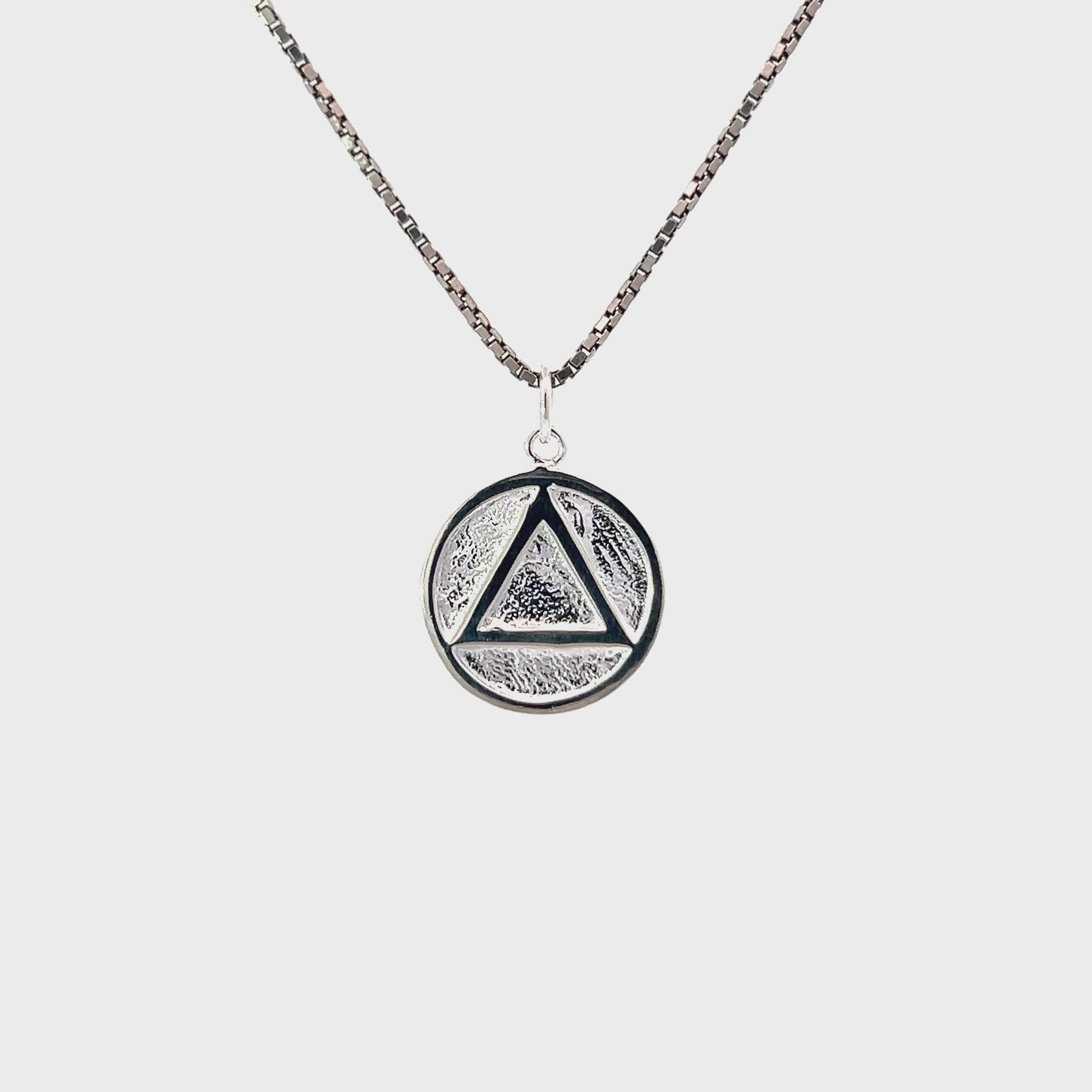 This elegant Sterling Silver AA Pendant features the timeless Alcoholics Anonymous triangle symbol set inside a solid textured coin-style circle. The design balances rugged texture with high-polished edges, creating a piece that’s both bold and meaningful—ideal for honoring your recovery journey.