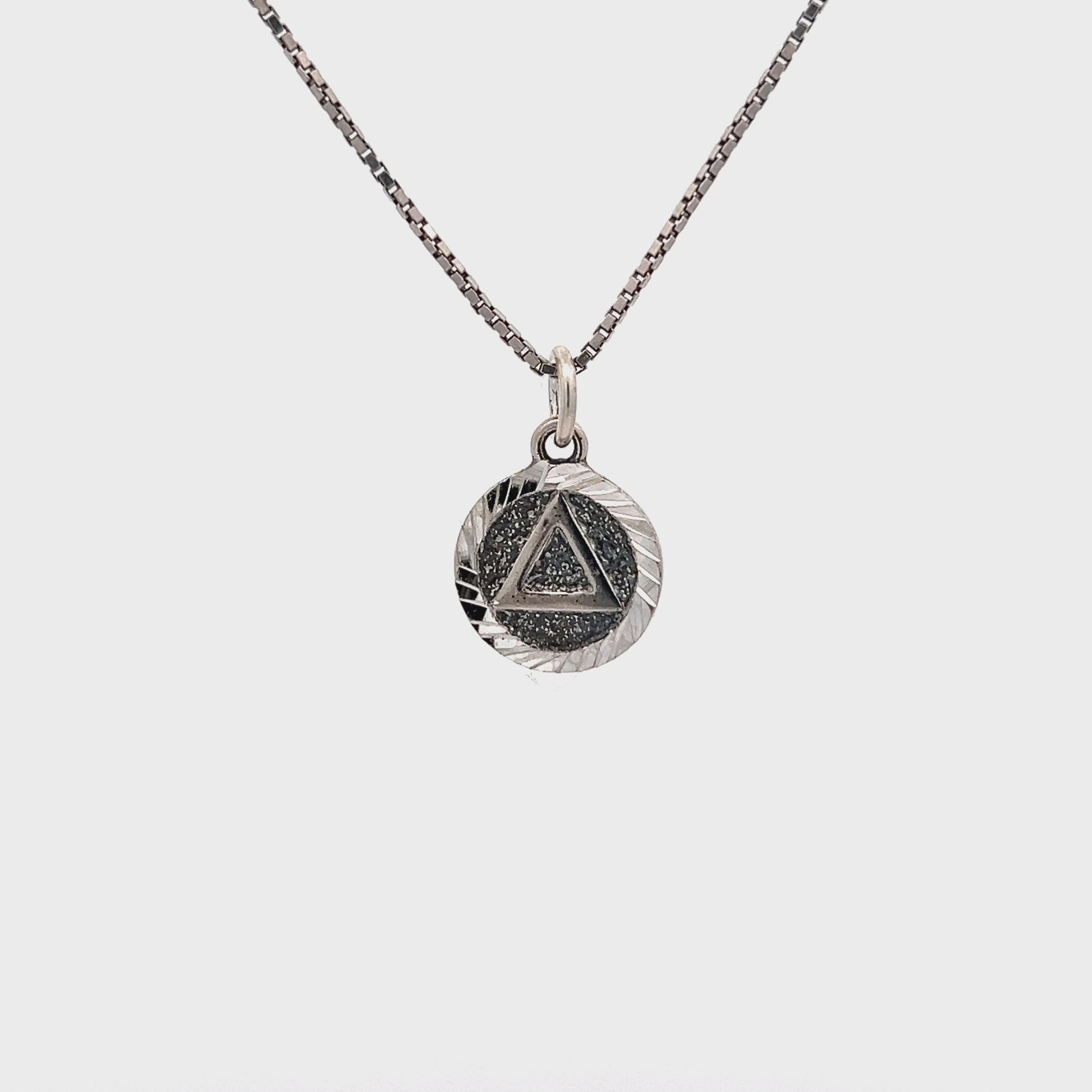 This striking Sterling Silver AA Pendant features a classic triangle recovery symbol set within a solid, textured coin-style circle, accented by brilliant diamond cut detailing. Its compact size and layered finishes make it a refined and symbolic piece for daily wear.